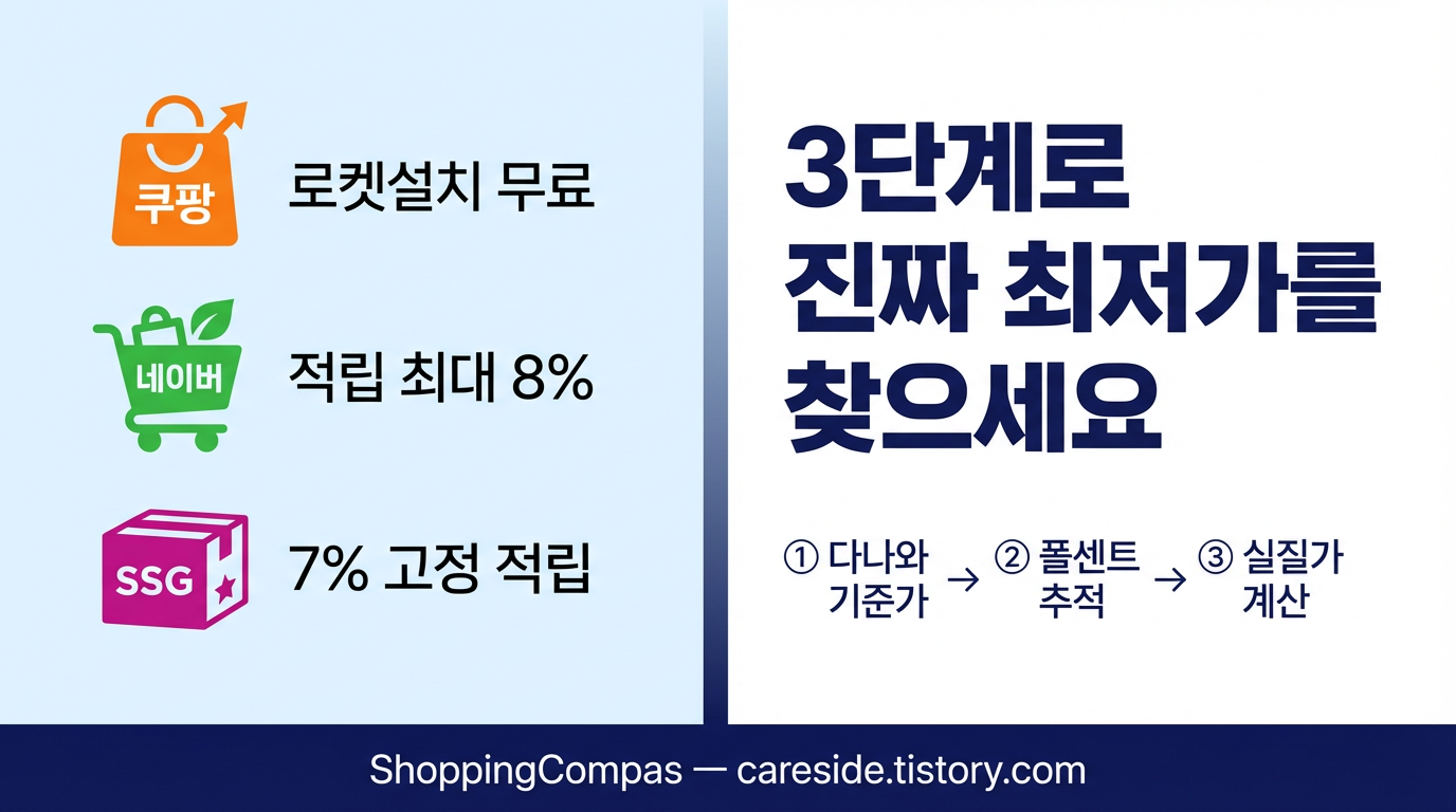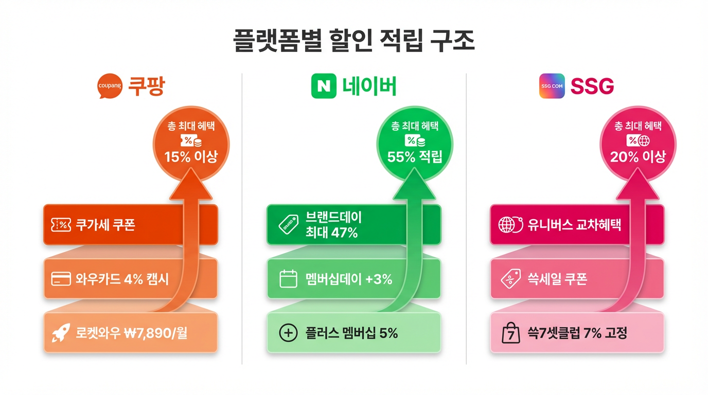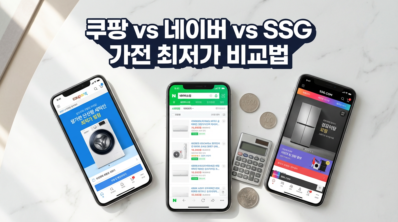 봄 이사를 앞두고 냉장고와 에어컨을 알아보던 중, 같은 모델이 쿠팡에서는 49만 원, 네이버에서는 52만 원, SSG에서는 47만 원으로 표시되는 경험을 하신 적 있을 것입니다. 여기에 멤버십 적립, 카드 청구할인, 쿠폰까지 더하면 실질 구매가는 플랫폼마다 최대 5~10만 원 이상 달라집니다. 이 글에서는 2026년 봄 기준으로 쿠팡·네이버·SSG 세 플랫폼의 할인 구조를 낱낱이 해부하고, 누구나 따라 할 수 있는 3단계 최저가 비교법을 안내합니다.